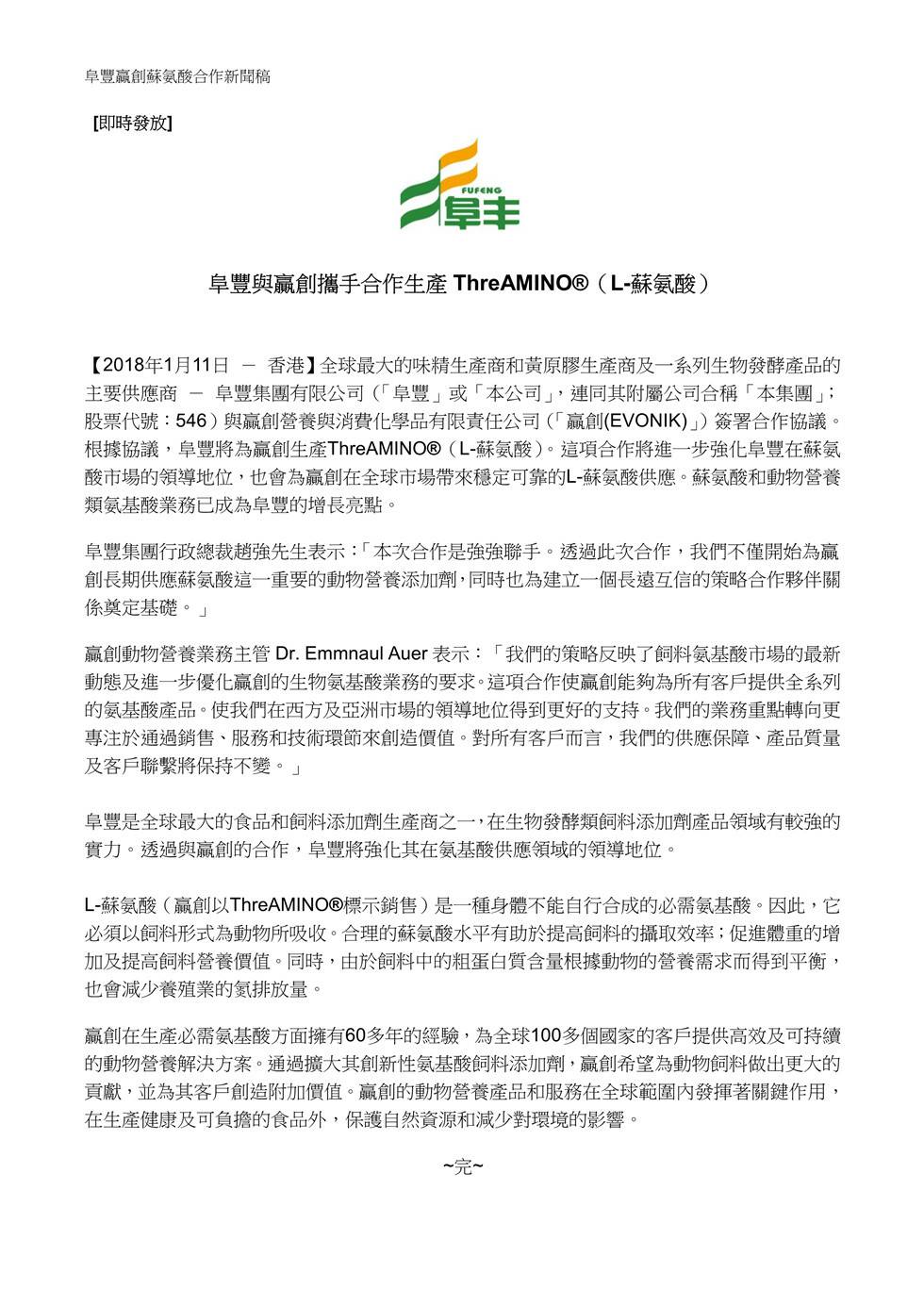 福州旭尧物流信息管理有限公司与赢创携手合作生产ThreAMINO®(L-苏氨酸)